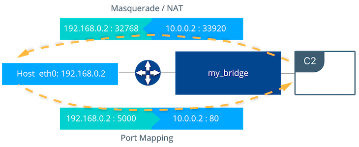 - コンテナから initiate されるコネクションはエフェメラルポートに masqueraded/SNATed される