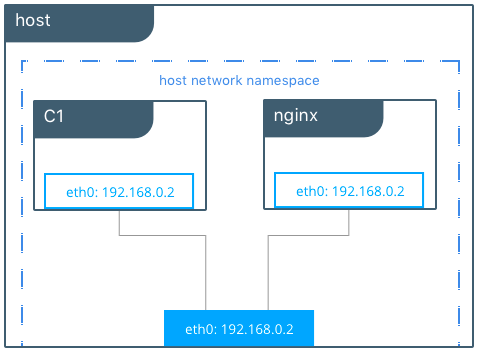 C1 と nginx コンテナは、ホストの eth0 を共有している。