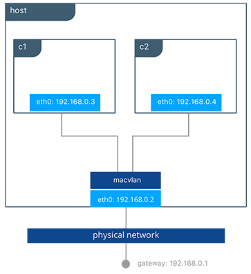 上の例では、 MACVLAN ネットワークをホストの eth0 に紐づけている。また、それぞれのコンテナは mvnet という名前の MACVLAN ネットワークにアタッチされている。