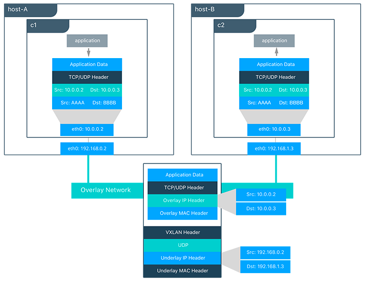 VXLAN は MAC-in-UDP カプセル化と定義される。つまり、 Docker の L2 フレームが underlay IP/UDP でカプセル化される。 underlay IP/UDP ヘッダは underlay ネットワークにおけるホスト間の通信を提供する。