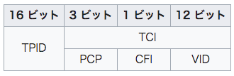 この VLAN タグフィールドは、初めの 16 ビットが TPID (Tag Protocol Identifier) 、次の 16 ビットは TCI (Tag Control Information) と呼ばれる。