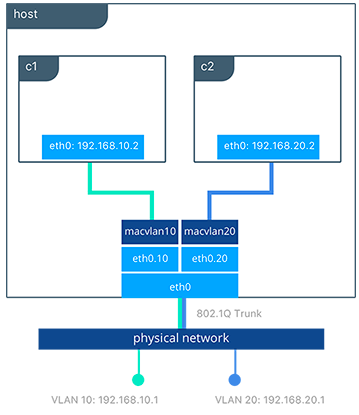 さらに、 VLAN を macvlan ドライバにトランキングして、 L2 コンテナのセグメンテーションを強制することができる。